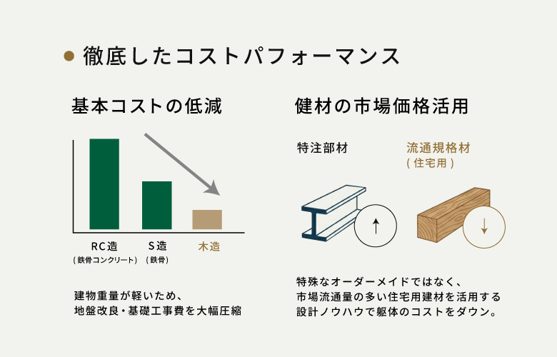 特殊な特注部材ではなく、住宅市場で大量に流通している標準的な木材・建材を組み合わせる設計手法により、材料費を抑制します。