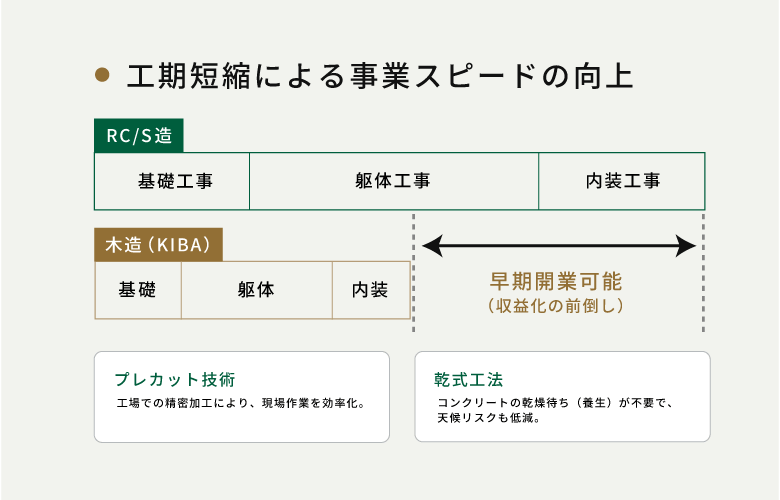 RC造のようにコンクリートが固まるのを待つ期間がないため、工期全体を圧縮でき、早期の事業開始が可能になります。